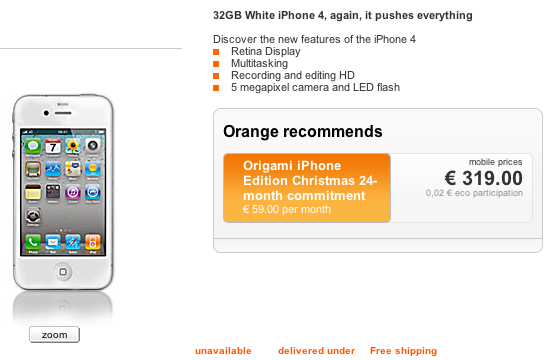 La compagnia telefonica Orange si aggiunge all’elenco dei carriers che hanno pubblicato sul proprio sito internet delle immagini dell’imminente iPhone 4 in versione Bianca. La notizia è che il prezzo esposto è di 20 euro maggiore alla versione Black.