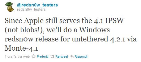 Tramite un Tweet pubblicato poco fa sul loro account per tester, il Dev-Team ci informa che verrà presto rilasciata una nuova versione di Redsn0w, compatibile con Windows, ed in grado di effettuare il Jailbreak su dispositivi iOS 4.2.1 utilizzando la tecnica Monte tramite iOS 4.1.