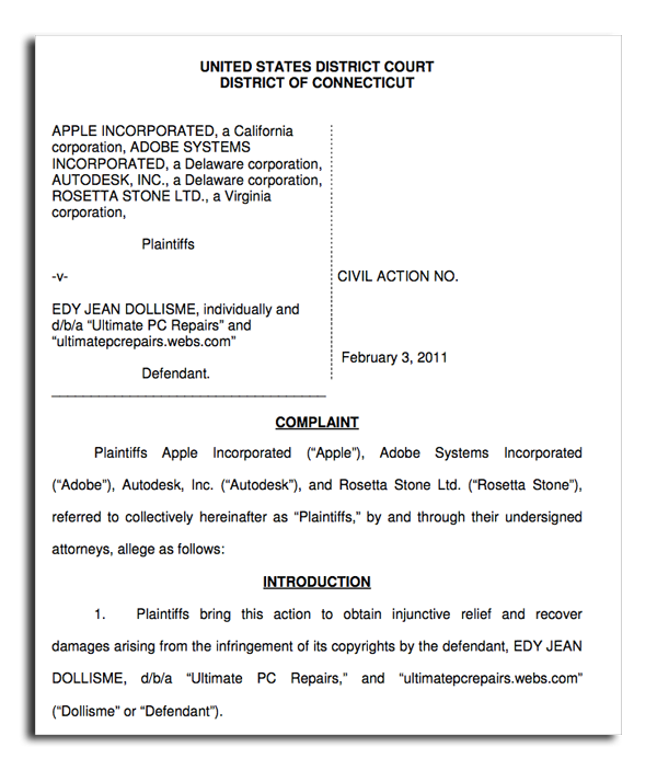 Riportiamo una notizia davvero interessante secondo la quale Apple e Adobe, insieme ad altri produttori di software, si sarebbero uniti per adire per vie legali contro Edy Jean Dollisme e il sito internet ultimatepcrepairs.webs.com. L’accusa, come avrete già capito, è di vendita di copie pirata tramite la piattaforma Craiglist e “Ultimate PC Repairs”.