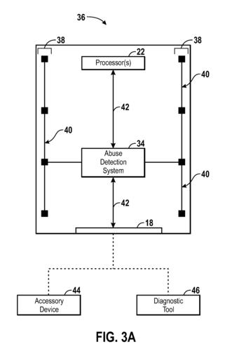 Il brevetto riguarda l’inserimento di alcuni sensori capaci di individuare un’eventuale manomissione e di segnalarla automaticamente al servizio di supporto tecnico. I sensori sarebbero capaci di segnalare anche un eventuale contatto del dispositivo con i liquidi. Il brevetto di Apple cita anche degli accelerometri capaci di rilevare le cadute del dispositivo e per concludere dei tool che, collegando il device via USB, scaricherebbero tutti i dati relativi al corretto utilizzo dell’apparecchio. Questi particolari sensori rimarrebbero sempre attivi, così da verificare manomissioni anche con il device spento.