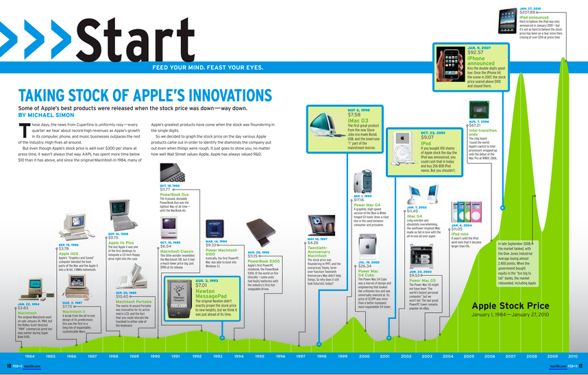 MacLife, una rivista americana con cadenza mensile a cui sono abbonato da diverso tempo, ha pubblicato nel suo ultimo numero un articolo davvero interessante che ho deciso di condividere con voi. Prendendo in esame l’andamento delle azioni Apple dal 1984 ad oggi è emerso come le migliori innovazioni sono state introdotte in corrispondenza di un valore basso nelle azioni.