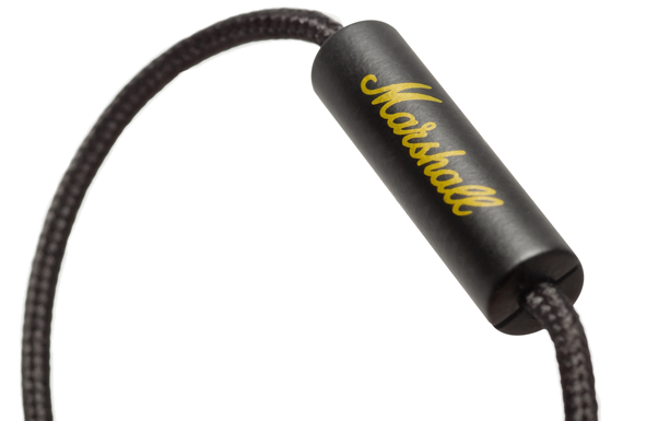 Ma prendiamo in considerazione i materiali, sui quali possiamo dilungarci un po’ di più nella descrizione. Gli auricolari sono di una plastica opaca, con dettagli come l’esterno o la zona intrauricolare in alluminio dorato. Il cavo è realizzato in “fabric cord”, una corda vera e propria a maglia fitta, che impedisce la formazione di nodi, le plastiche utilizzate sono di ottima fattura, resistenti e opache, quindi meno soggetta a graffi rispetto alla plastica lucida che troviamo in cuffie di altre marche. Sul microfono e all’interno degli auricolari è posto il logo Mashall.