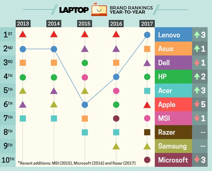 Alla classifica con le stime reali di vendita, si affianca anche la classifica di Laptopmag, un sito specializzato che colloca Apple ancora una volta al quinto posto. Nella realizzazione di questa graduatoria, sono state tenute in considerazione le recensioni degli utenti, il design, il supporto, l’innovazione, prezzo e personalizzazioni e garanzia, attribuendo per ognuno di questi un punteggio.