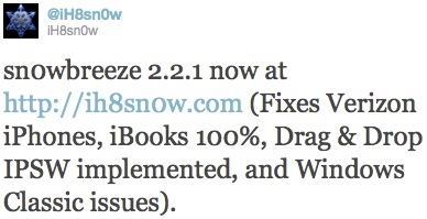 Con versione 2.2.1 di Sn0wBreeze lo sviluppatore, oltre che correggere alcuni problemi relativi all’iPhone 4 di Verizon, ha introdotto la possibilità di caricare il firmware originale semplicemente trasportandolo nella finestra dell’applicazione ed ha sistemato definitivamente tutti i bug relativi ad iBooks (che ora risulta funzionante al 100%).