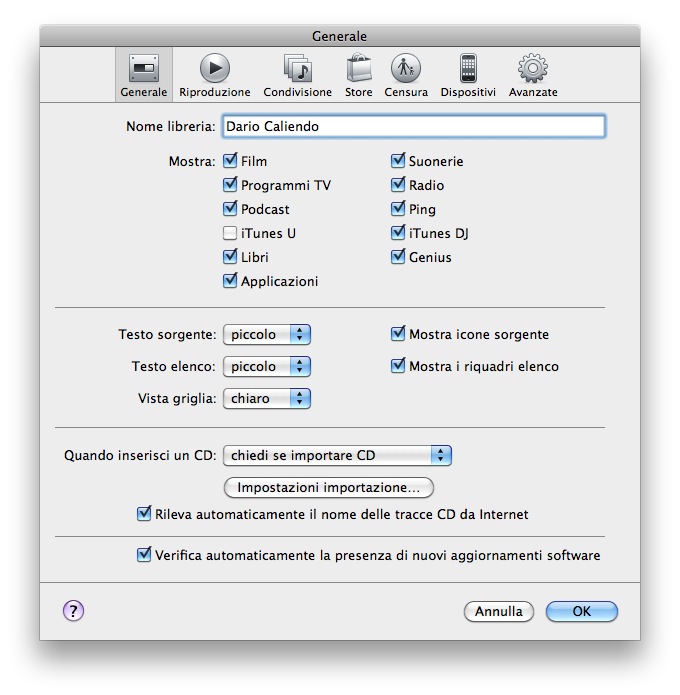 1. Lanciamo iTunes e clicchiamo subito sulla barra principale per accedere alle Preferenze del programma. Dalla schermata “Generale”, cliccate su “Impostazioni Importazione”, infine per l’etichetta “Importa Utilizzando” selezionate codificatore AIFF dal menu a tendina.