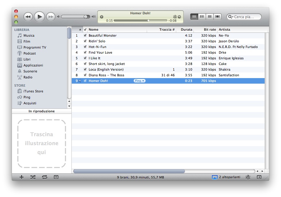 2. Adesso torniamo ad iTunes e selezioniamo il brano della libreria che vogliamo trasformare. Trattandosi di suonerie per notifiche di messaggi io vi consiglio di rendere i brani molto più brevi dei 30 secondi massimi consentiti. Con lo stesso procedimento, potete importare in iTunes anche i suoni o i clip audio che preferite e che volete impostare come suoneria dei messaggi. Nella guida partiremo da zero prendendo come esempio una clip audio che ho registrato dalla TV, contenente il grandioso D’oh! di Homer Simpson.