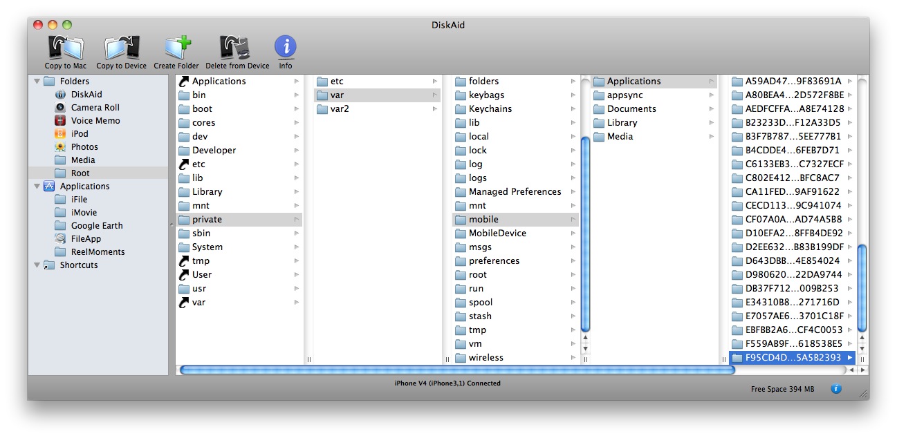 Dopo aver creato la suoneria, non dobbiamo far altro che copiarla nella cartella dell’applicazione, ed è questa forse la fase più “noiosa”. In effetti non è nulla di estremamente complicato, l’unica cosa che vi farà perdere tempo è trovare la cartella nella quale è stata installata l’applicazione: a differenza delle applicazioni native, tutte le applicazioni di terze parti installate da iTunes si trovano nel percorso /private/var/mobile/applications, suddivise in cartelle con dei nomi codificati e del tutto non riconoscibili.