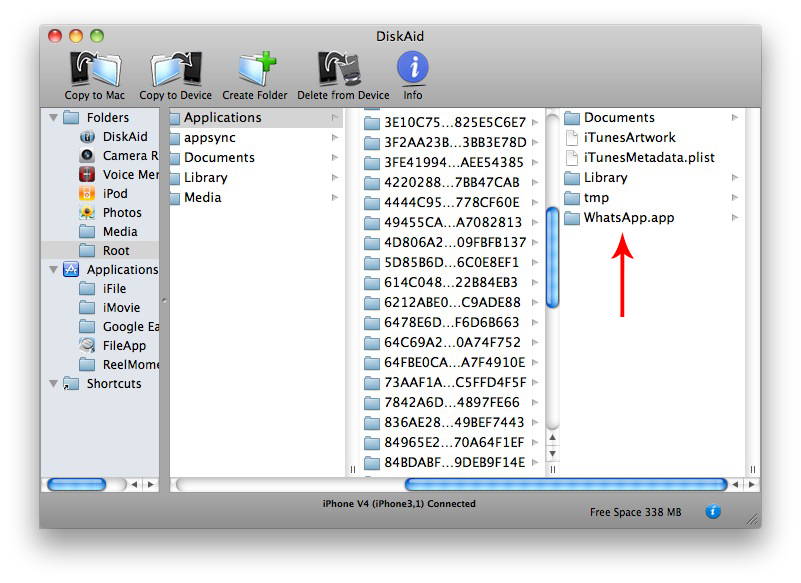 Per trovare la cartella nella quale è necessario copiare la suoneria dovete armarvi di tanta pazienza e scorrerle tutte, finché non troverete quella contenente la cartella WhatsApp.app. Come potete vedere dall’immagine sottostante, ogni cartella numerica contiene una sottocartella con il nome dell’applicazione installata: