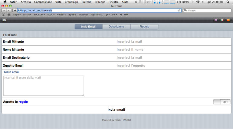 Tutti gli interessati, non devono far altro che collegarsi a questo sito http://tecrail.com/falsemail e compilare i campi necessari per l’invio di una mail. Provatelo, e se il servizio vi è utile, salvatelo come Webclip con l’iconcina fissa sulla vostra SpringBoard.