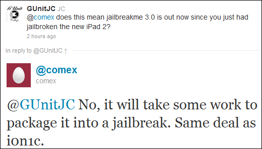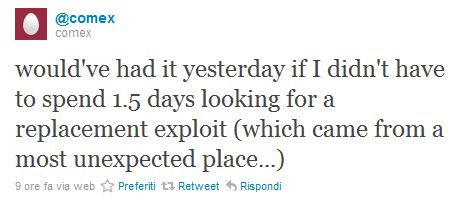 Non si hanno ancora certezze su un reale aggiornamento del programma di Comex ma nemmeno si può escludere. Infatti l’hacker su Twitter rilascia una dichiarazione in cui dice che l’exploit per il jailbreak del nuovo OS è situato in una zona davvero inaspettata di iOS 4.3. Potrebbe essere nuovamente Safari?