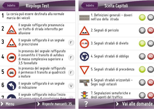 - Modalità Esercitazione: consente di effettuare una simulazione d’esame – con domande casuali – circoscritta ai soli capitoli scelti, in modo da cominciare ad abituarsi al test, ed a focalizzarsi sui capitolo più critici.