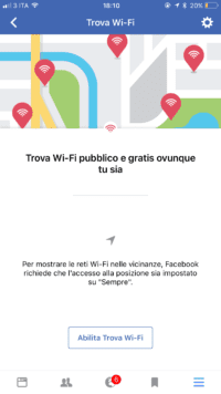 Questa funzione di Facebook è nata nel 2016 ma soltanto adesso è stata estesa a tutti. Si chiama “Trova Wi-Fi” e come si può facilmente intuire dal nome, permette di trovare e di localizzare sulla mappa tutti gli hotspot WiFi Gratuiti nelle vicinanze.