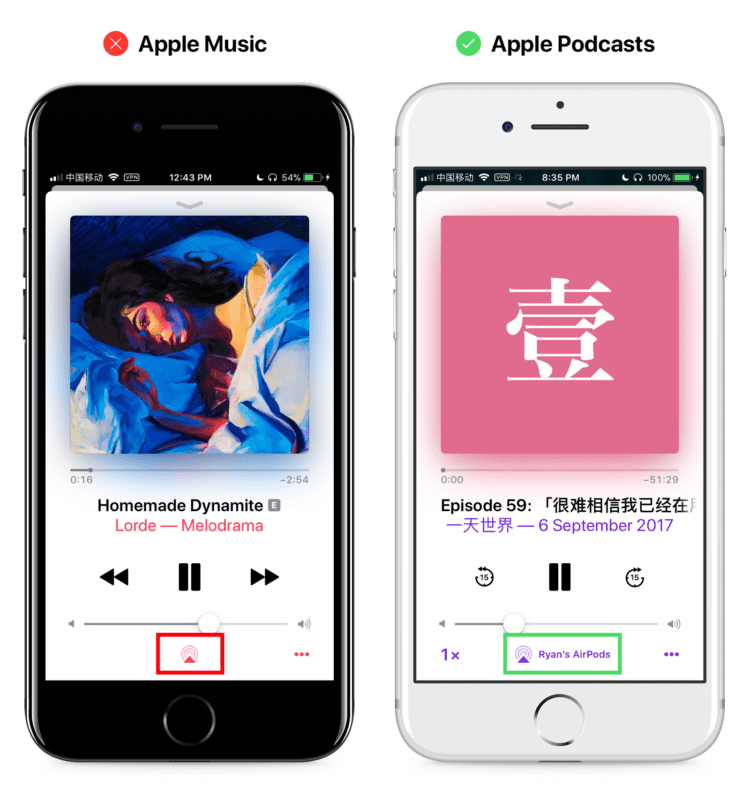 Per qualche strano motivo, la schermata di Apple Music non mostra più il nome delle AirPods o di altri dispositivi connessi con AirPlay mentre nell’app Podcast (che utilizza esattamente lo stesso player dal punto di vista grafico), appare anche il nome del dispositivo AirPlay connesso.