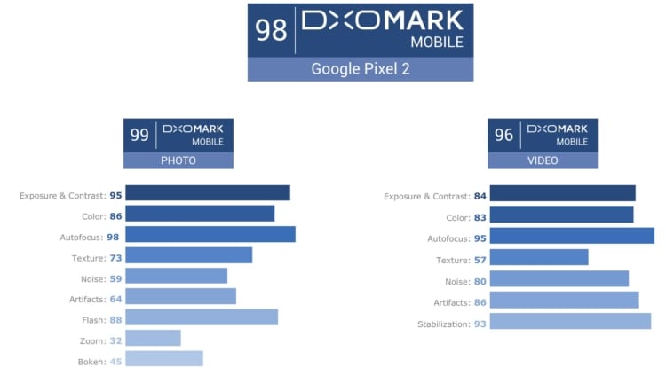 Fin ora l’iPhone 8 Plus era il dispositivo con il punteggio più alto per quanto riguarda il comparto video, superiore anche al Note 8 ma il Pixel 2 lo supera anche sotto questo aspetto fino a totalizzare 98 punti complessivi.