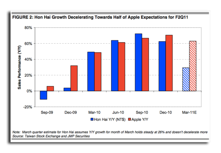 “La crescita di Foxconn è rallentata passando dall’84% dello scorso Dicembre al 37% di Gennaio, fino a raggiungere il 26% a Febbraio.” Sulla base di questi dati, le previsioni per le vendite di Apple del prossimo trimestre fiscale sono state ridotte a 22 miliardi di dollari, rispetto ai precedenti 23. “Possibili cause, del rallentamento di Foxconn, potrebbero essere collegate alle vendite di iPhone soprattutto considerando la forte competizione di Android, debolezze nel calcolo della quantità dei prodotti in caso di crescita della domanda di tablet, ed ancora eventuali rischi nella nelle consegne di iPad 2”.