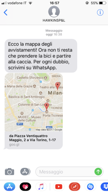 Il numero è totalmente gratuito, come era facilmente prevedibile. Vi risponderà una voce registrata, ma prestate attenzione, perché questa verrà improvvisamente interrotta da quella di un personaggio a voi molto caro: Dustin Henderson! Il protagonista vi avviserà che a Milano si stanno registrando strani eventi, avvistamenti di un terrificanti demogorgone. Al termine della chiamata riceverete un SMS contente una mappa con diversi PIN in vari punti di Milano dove è possibile trovare riferimenti a Stranger Things.