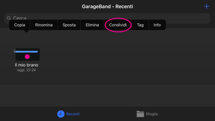 10. Adesso toccate la prima icona in alto a sinistra per tornare a “I Miei Brani”. Qui troverete il vostro nuovo brano. Toccate con una pressione prolungata sull’icona e comparirà il menu contestuale dal quale selezionerete “Condividi”.