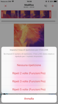 6. Avviate l’applicazione che partirà già sul tab Video. Selezionate il primo video che volete convertire, poi cliccate la freccina avanti in alto a destra e scegliete “Nessuna ripetizione”. Verrà generata una preview, quindi cliccate il tasto “Salva foto Live” che trovate in basso a destra.