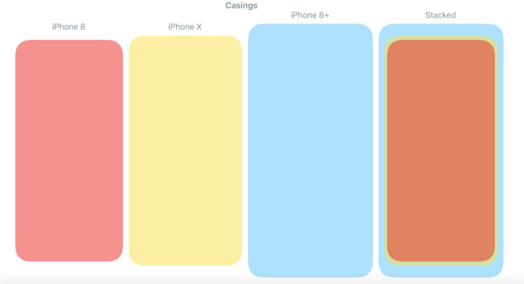 La sagoma rossa rappresenta lo schermo dell’iPhone 8, decisamente più piccola rispetto all’iPhone X rappresentato in giallo. Poi troviamo quella blu dell’iPhone 8 Plus che è visibilmente più larga rispetto all’iPhone X e leggermente meno alta.