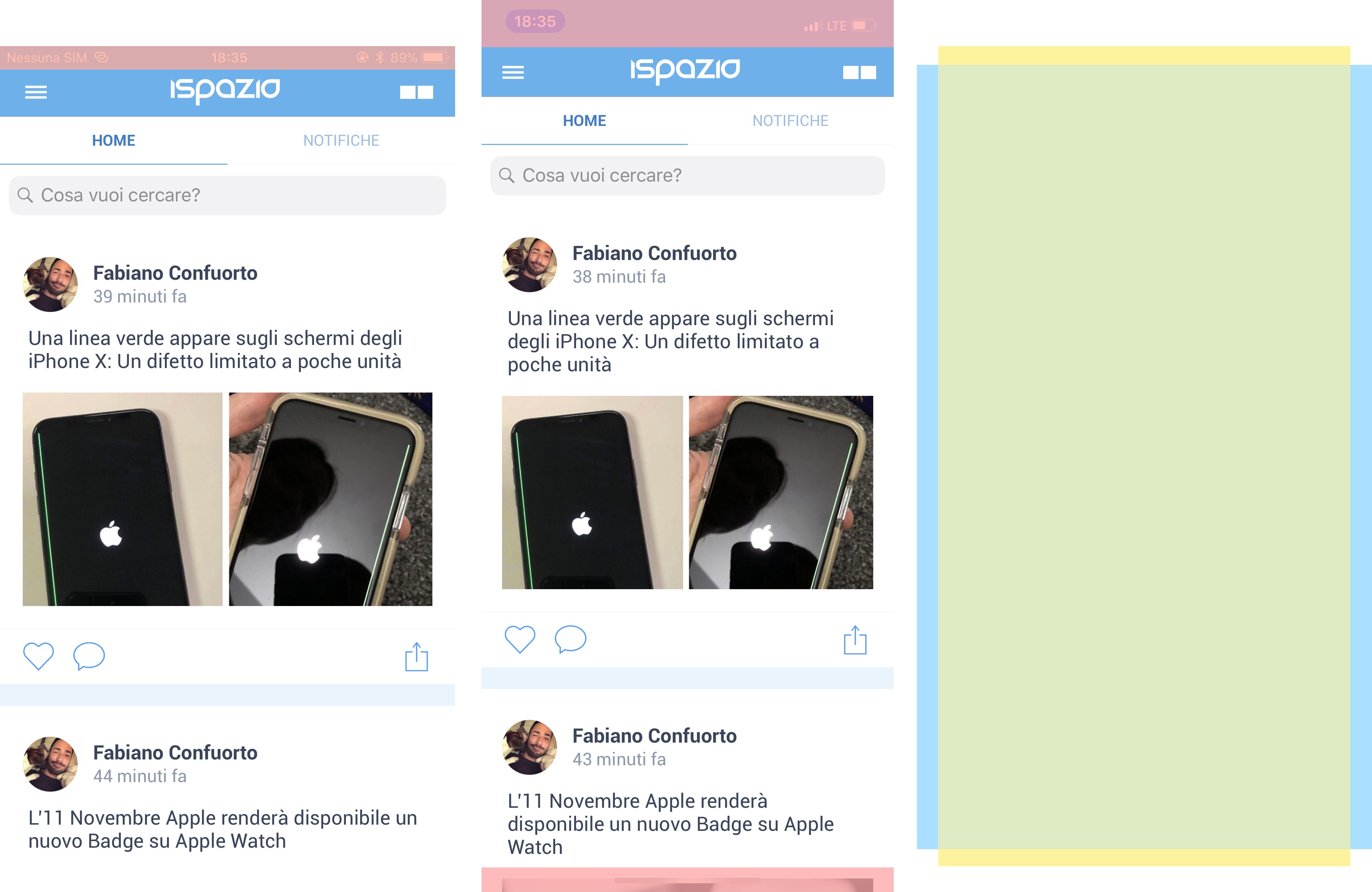 Sovrapponendo il tutto, rispetto allo schermo dell’iPhone 8 Plus, notiamo che le parti gialle (di iPhone X) eccedono di poco e riguardano le parti laterali superiori (interrotte dal notch) ed una parte inferiore con angoli arrotondati. L’8 Plus tuttavia, ha degli eccessi in entrambi i lati.