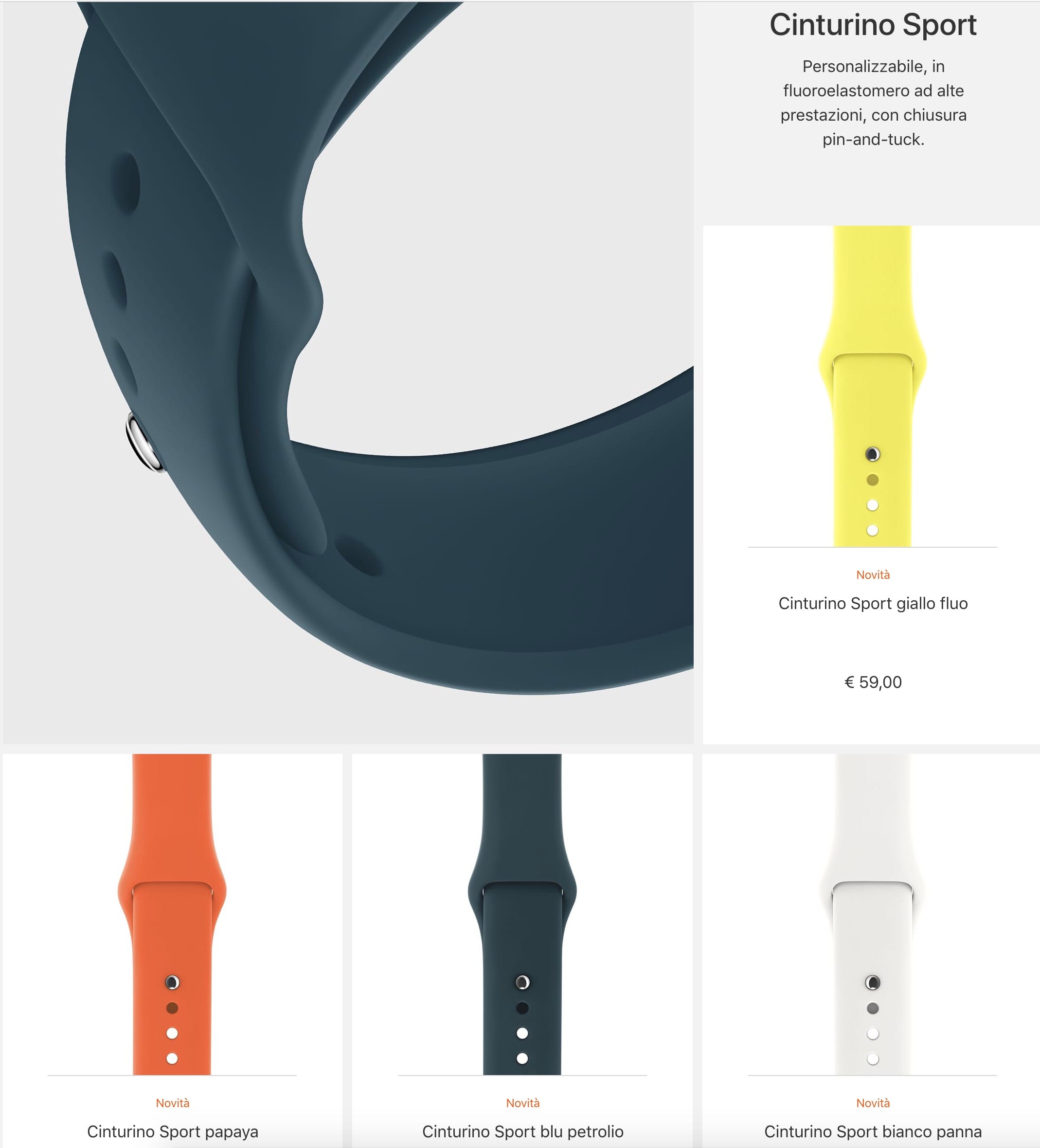 Partendo dall’Apple Watch, troviamo 3 nuovi colori nei cinturini “Sport”: giallo fluo, papaya (arancione) e blu petrolio. Sono stati rifiniti anche il bianco panna e grigio. Le tre nuove colorazioni le ritroviamo anche nelle custodie in silicone per iPhone. I nomi in italiano sono: blu cosmo, papaya e giallo fluo.