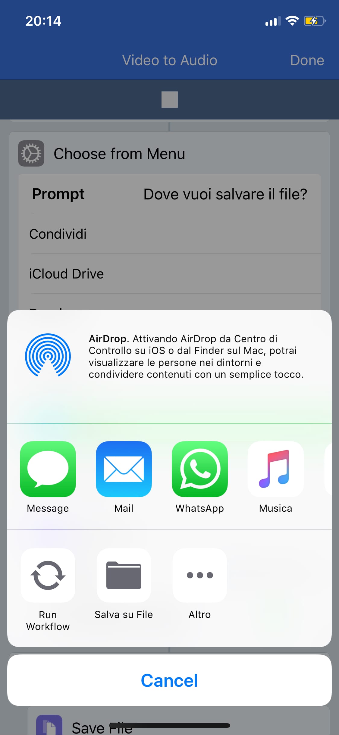 Il Workflow di oggi vi permette di scegliere un video dal Rullino dell’iPhone oppure da un servizio di archiviazione come iCloud e Dropbox. Dopo aver selezionato il video, potrete convertirlo in “solo Audio”, scegliendo tra 3 diversi formati (e qualità). Dopo aver effettuato la conversione, potrete salvare la traccia audio sui servizi di archiviazione oppure inoltrarlo come “Nota Vocale” tramite Whatsapp ed altre applicazioni.