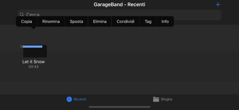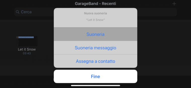 4. Dopo aver premuto su “Copia su GarageBand”, la suoneria verrà trasferita e caricata. Attendete l’upload, dopodichè cliccate e tenete premuto per un secondo sul file. Appena lo rilascerete, apparirà un menu contestuale nero, dove dovrete selezionare “Condividi“.