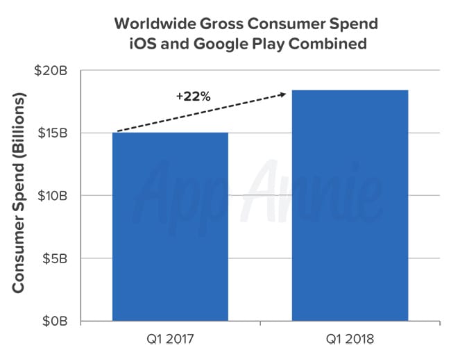 Il 2018 è iniziato con il trimestre più forte che il mercato delle applicazioni abbia mai visto, sconvolgendo i record stabiliti nel quarto trimestre del 2017 sia per quanto riguarda gli acquisti da parte dei consumatori sia per i download. I download globali combinati di iOS e Google Play, infatti, sono aumentati di oltre il 10% fino a raggiungere quota 27,5 miliardi, la cifra più alta mai registrata. La spesa complessiva degli utenti iOS e Google Play ammonta, invece, a 18,4 miliardi di dollari, con una crescita del 22%.