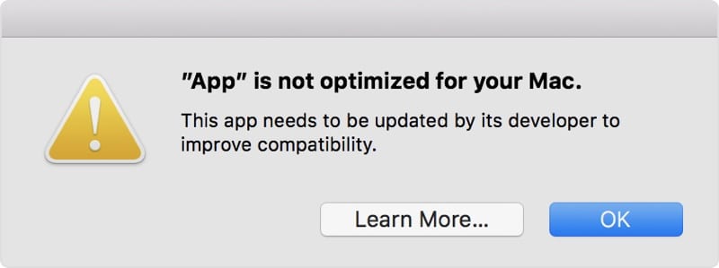 Con il rilascio della recente versione di macOS High Sierra 10.13.4, la prima volta che gli utenti avvieranno un’app che non supporta i 64 bit riceveranno un popup circa la mancata ottimizzazione dell’app per il proprio Mac.