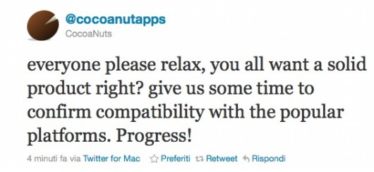 Aggiornamento 5: Nuovo Tweet da parte di CocoaNuts i quali hanno portato a termine i test sui Sony Ericsson e sui terminali Windows Mobile. Ottime notizie perchè trasferimento dei file è avvenuto con successo in tutti i casi! Siamo sempre più vicini al rilascio, previsto per oggi ad un ora ancora imprecisata.