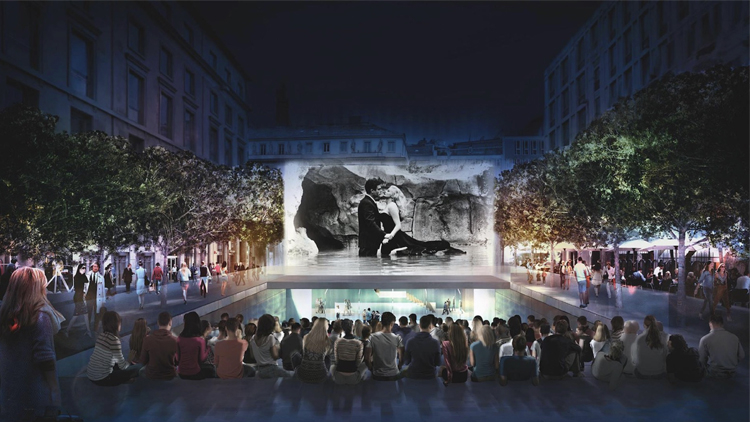 Nella piazza verrà allestito un grande schermo sul quale verranno proiettati filmati e le persone potranno sedersi sulla grande scalinata per guardarli, per lavorare all’aperto o scambiare chiacchiere. La grande scalinata si compone di 6 gradini larghi affiancati da scalini adeguati.