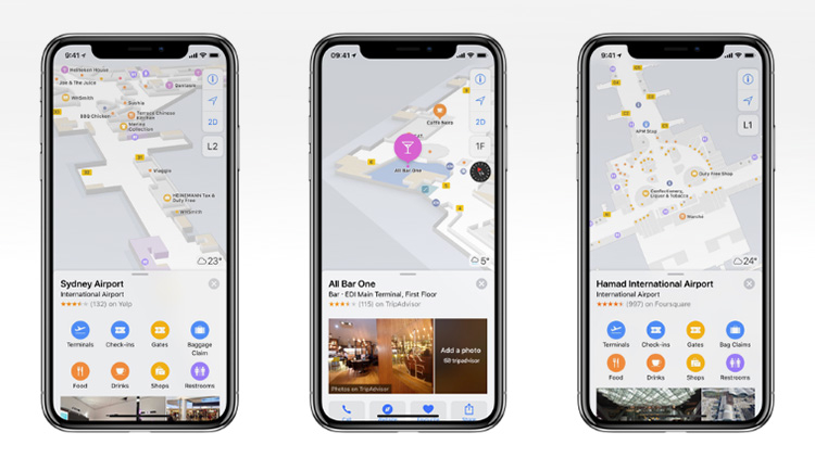 Le mappe indoor consentono agli utenti che utilizzano l’applicazione Mappe di Apple di esplorare il layout interno degli edifici su più piani, con una indicazione precisa della propria posizione, utilissima per orientarsi, appunto, in luoghi come aeroporti e centri commerciali.