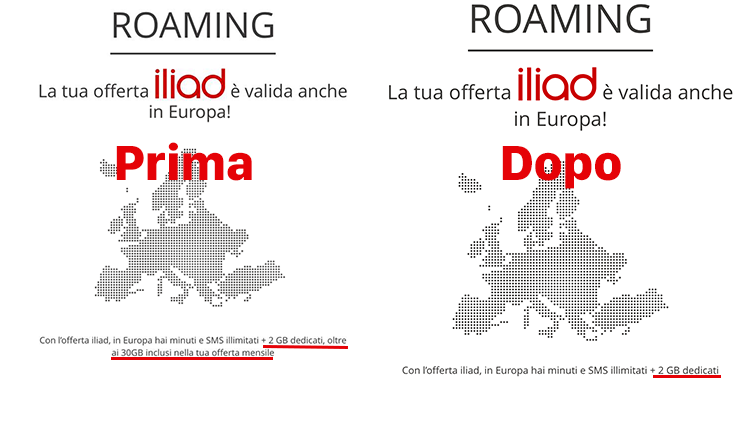 Precedentemente c’era scritto: Con l’offerta Iliad, in Europa hai minuti e SMS illimitati + 2GB dedicati oltre ai 30GB inclusi nella tua offerta mensile.