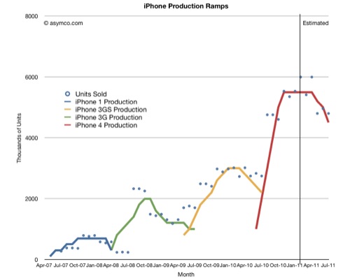 Asymco ha effettuato degli studi riguardanti le vendite dei precedenti modelli di iPhone, da questi è possibile fare una previsione sulle vendite del futuro iPhone 5 che potrebbe raggiungere i 100 milioni di unità vendute.