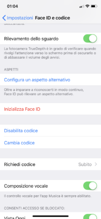 La seconda novità riguarda invece Face ID che adesso può essere configurato con un aspetto alternativo. Face ID è in grado di migliorare automaticamente con il tempo, riconoscendo sempre meglio il proprietario dell’iPhone ma, qualora dovessimo avere difficoltà in alcune circostanze, potremmo effettuare una seconda scansione del nostro viso, magari mentre indossiamo occhiali, cappello etc, in maniera tale da renderlo più preciso. Potenzialmente possiamo anche avviare la scansione sul volto di un’altra persona, garantendogli così l’accesso al nostro smartphone (utile per i genitori oppure per i partner).