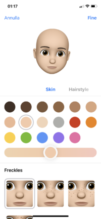 Passiamo alla schermata successiva, dove si decidono i capelli. Prima di tutto si seleziona il colore e poi si scorre tra le varie acconciature proposte. Ci sono sia capigliature femminili che maschili ed è anche possibile realizzare un Memoji calvo o rasato.
