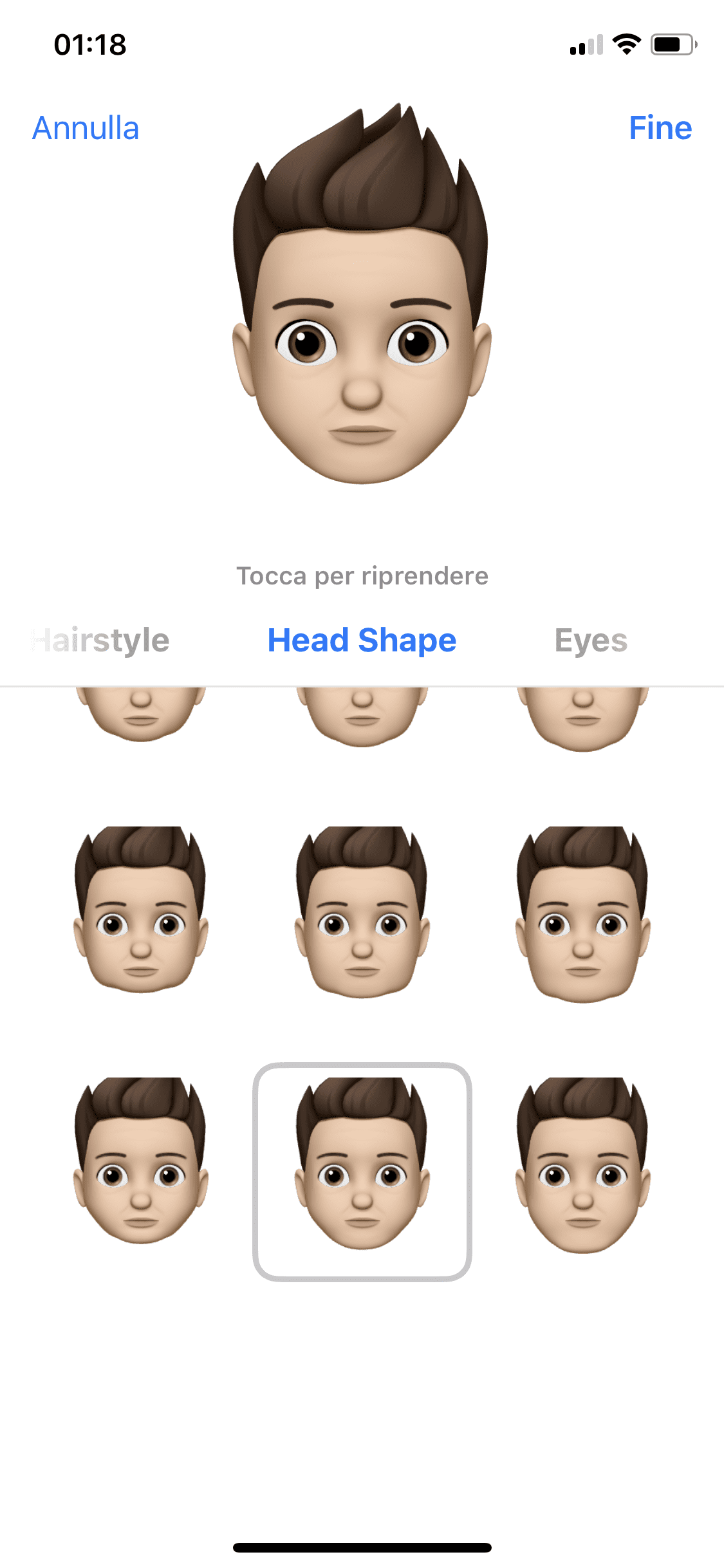 Per prima cosa apriamo l’applicazione Messaggi e selezioniamo il bottone Animoji. Qui troveremo tutti gli animaletti già disponibili ma vedremo anche un tasto “+” dal quale realizzeremo la nostra faccina personalizzata.