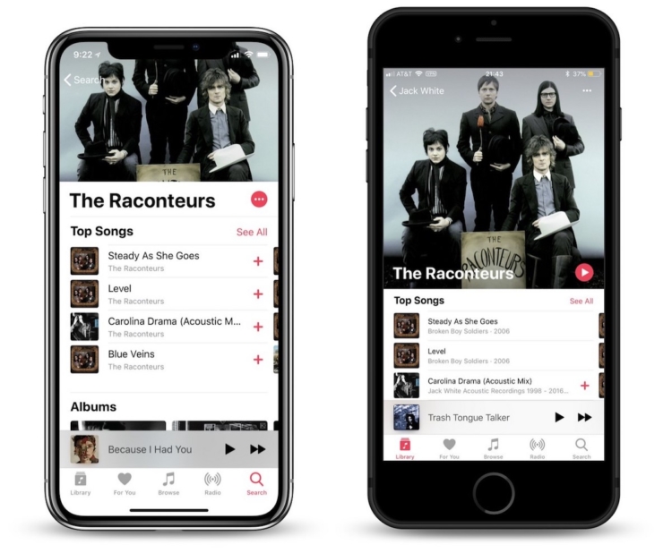 L’unica nota negativa riguarda iPhone X, poiché sembra che il nuovo design non sia ancora ottimizzato. Nel confronto con iOS 11 che trovate sotto, notate come sull’ultimo top di gamma di Apple, a causa della tacca, le immagini vengono tagliate non correttamente (oscurando anche il volto di due membri della band, ad esempio).