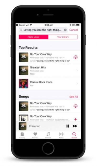 Come mostra l’immagine in calce, scrivendo la frase “Loving you isn’t the right thing to do” (ovvero la prima strofa del brano “Go Your Own Way” dei Fleetwood Mac), Apple Music trova con successo il brano desiderato (e tutte le raccolte in cui appare).