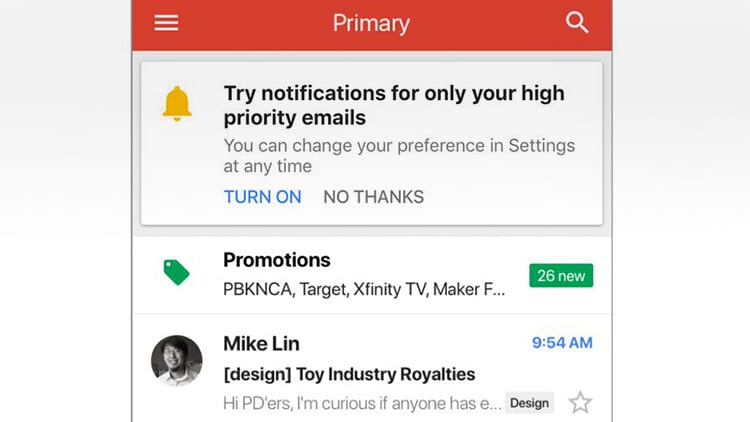 Gmail adesso utilizza il machine learning e l’intelligenza artificiale di Google per identificare i messaggi e capire automaticamente quali notificarci tramite push e quali no.