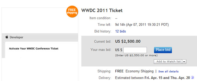 Dopo poche ore dall’annuncio del WWDC tutti i biglietti sono andati esauriti. Di solito il Sold Out si verificava a distanza di qualche giorno dall’annuncio, ma stavolta i tagliandi sono andati letteralmente a ruba in sole 10 ore. Ovviamente qualcuno sta già cercando di rivendere i biglietti su eBay chiedendo cifre assurde.