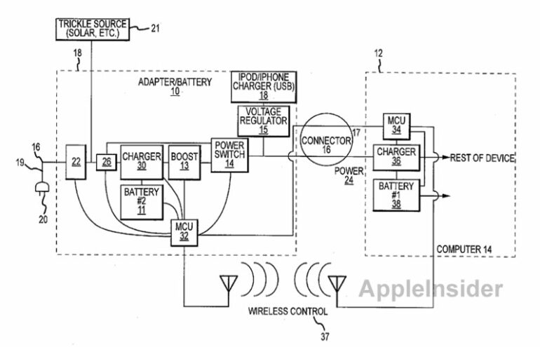 La soluzione proposta da Apple comporterebbe l’inserimento di un caricatore “intelligente” con un processore integrato. In questo modo il caricatore saprebbe quando distribuire carica all’adattatore e quando alla batteria stessa. Attraverso l’inserimento di una porta USB sarebbe inoltre possibile non soltanto ricaricare dispositivi come Mac, ma anche iPhone o iPod. Infine grazie ad un adattatore wireless si potrebbe permette al dispositivo collegato di accedere all’adattatore per la ricarica anche se non fisicamente connesso.