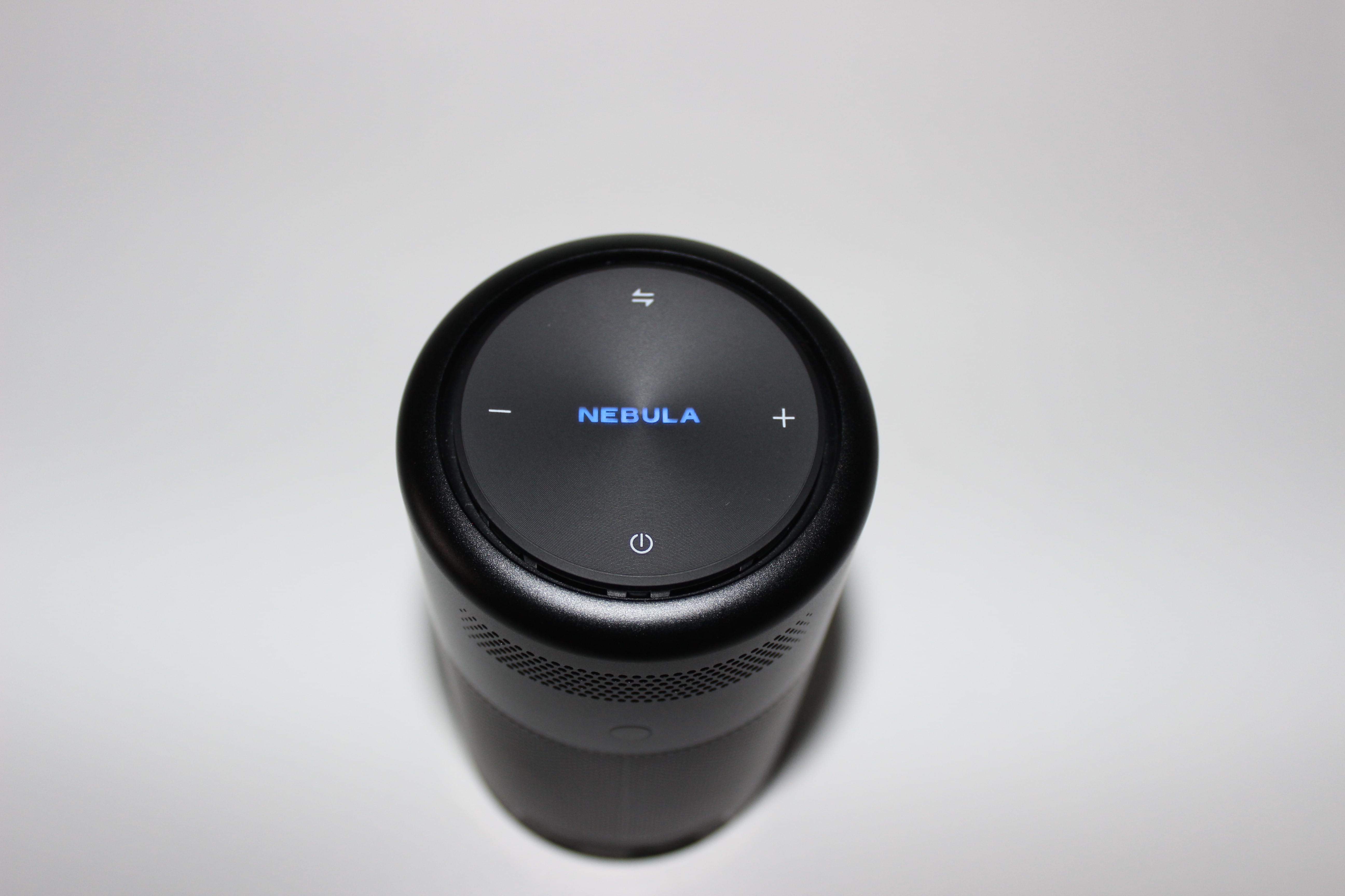 Nella parte superiore sono presenti 4 tasti: Accensione/Spegnimento, due tasti per regolare il volume ed un tasto che permette lo switch tra la modalità proiettore ad altoparlante. Proprio così: Nebula può essere utilizzato anche come uno smart speaker da scrivania!