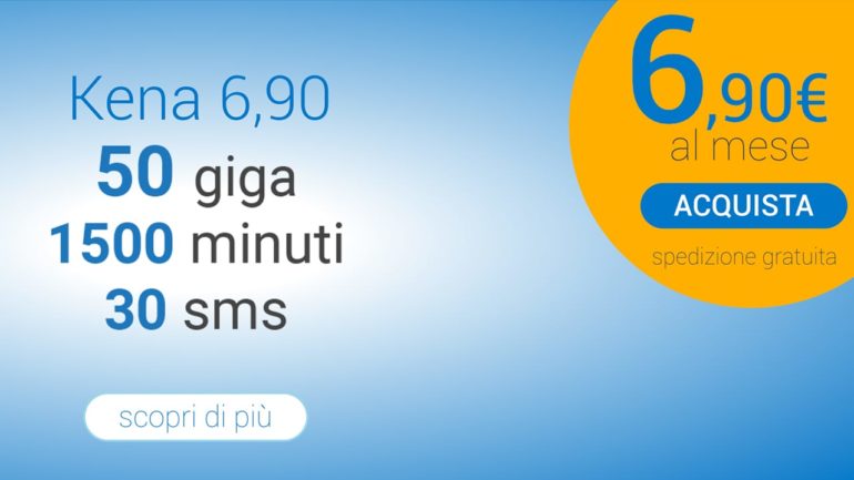 Il costo è di 6,90€ al mese, per sempre. E’ un’offerta disponibile esclusivamente online. L’acquisto della SIM, la spedizione, l’attivazione ed il primo mese di offerta hanno un costo complessivo di 20€ una tantum. Kena Mobile, un po’ come Iliad, non aggiunge costi a servizi tipo “Ti ho cercato” e non permette di attivare abbonamenti cliccando per errore su banner pubblicitari. Internet con Kena è in 3G quindi un po’ più lento rispetto al 4G, anche se l’operatore ha promesso l’upgrade al 4G a breve. Si attiva da qui.
