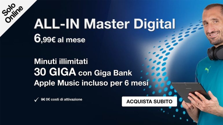 L’offerta ALL-IN Master Digital si attiva da qui. Esiste anche una versione “potenziata” di questa offerta che offre 60GB e minuti illimitati a 9,99€ al mese. Quest’ultima si chiama ALL-IN Power Digital e si attiva da qui.