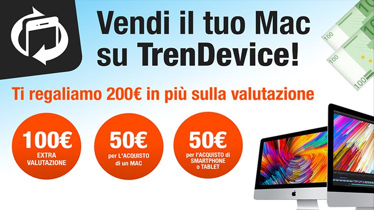 Su TrenDevice potete vendere il vostro Mac e ricevere in regalo ben 200€ in più sulla valutazione. Fino al 12 ottobre avrete: 100€ di extravalutazione utilizzando fin da subito il codice SUPER100, inoltre, una volta effettuata la vendita del vostro Mac, riceverete anche 2 codici sconto del valore di 50€ l’uno, validi per l’acquisto rispettivamente di un Mac ricondizionato su BuyDifferent e di uno smartphone o un tablet ricondizionato a vostra scelta su TrenDevice, per un totale quindi di 200€ in regalo in più sulla valutazione del vostro Mac. Si tratta quindi di un’offerta da non perdere. In questa pagina potete avere maggiori informazioni riguardo questa imperdibile promozione.