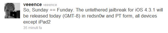 Aggiornamento: Arrivano le conferme ufficiali. Veeence su Twitter riporta che potremo eseguire il Jailbreak Unthetered dei nostri dispositivi da oggi.