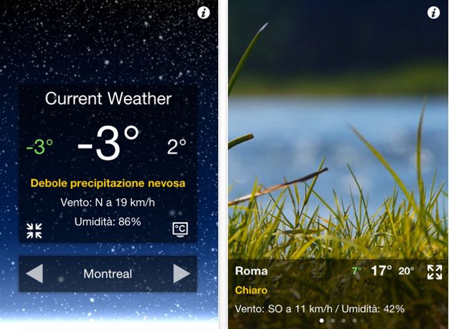 - informazioni meteo in tempo reale in base alla posizione corrente (GPS o WiFi) ovunque ci si trovi nel mondo;