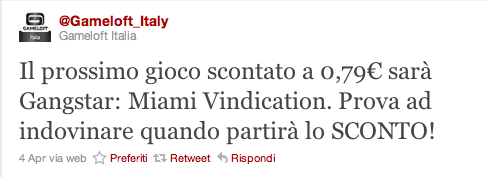 Due giorni fa su Twitter, Gameloft ha pubblicato una sorta di indovinello per far capire agli utenti la data dello sconto del prossimo gioco, che, come già annunciato, sarebbe stato “Gangstar: Miami Vindication”. Oggi finalmente troviamo questo bellissimo gioco in stile GTA scontato a 0,79€, un affare da non lasciarsi scappare!
