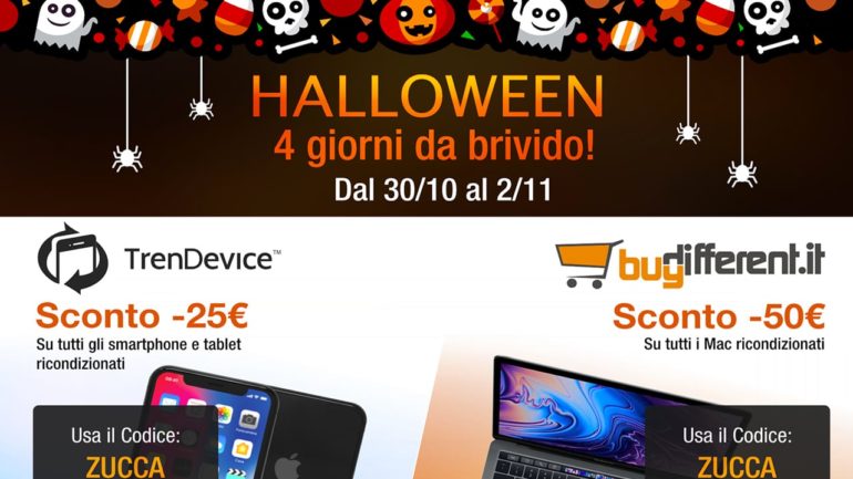 I siti partner TrenDevice e BuyDifferent, per festeggiare assieme a voi Halloween, hanno preparato 4 giorni di sconti da brivido! Dal 30 ottobre al 2 Novembre su TrenDevice vi aspetta uno sconto di 25€ valido su tutti gli Smartphone e Tablet ricondizionati, mentre su BuyDifferent avete ben 50€ di sconto valido su tutti i Mac Ricondizionati. Per usufruire degli sconti su entrambi gli e-commerce, il codice da utilizzare è ZUCCA.